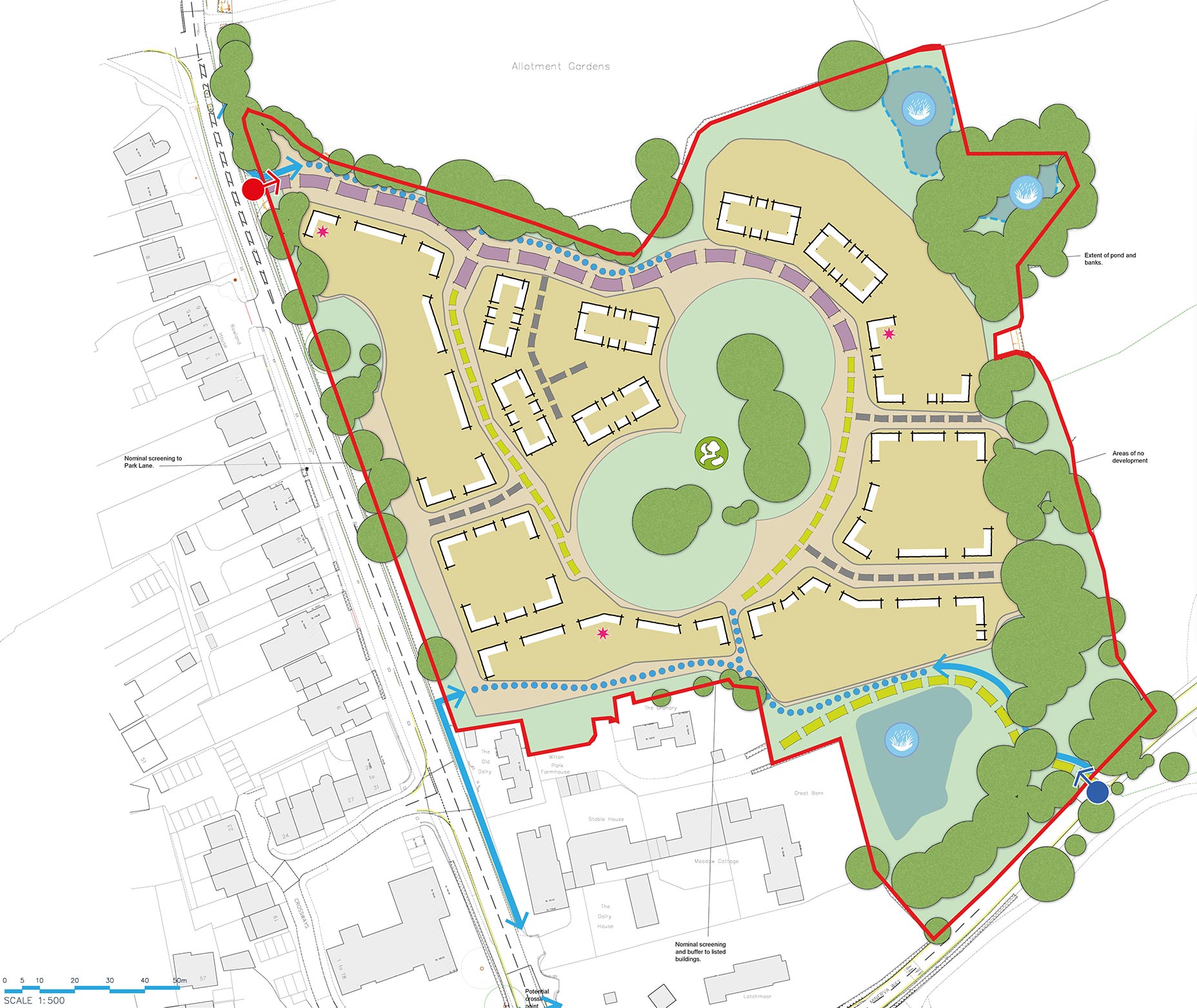 - Retaining and enhancing existing trees and hedgerows to preserve the semi-rural character of the site.